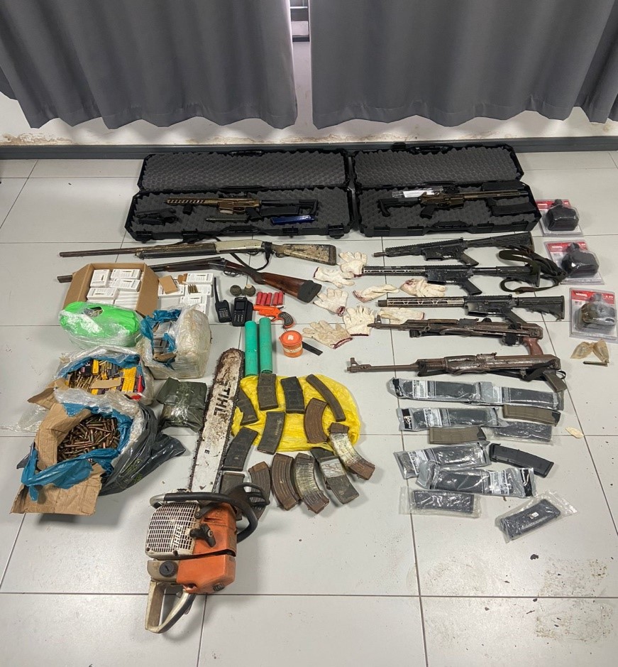 Bij de verdachten zijn in beslag genomen zes vaten met vliegtuigbrandstof, zeven aanvalsgeweren, vuistvuurwapens, jachtgeweren, een grote hoeveelheid scherpe munitie, twee ATVās, een motorfiets, portofoons, handschoenen en een kettingzaag. Ook twee handgranaten, twee ATVās en een motorfiets werden aangetroffen.