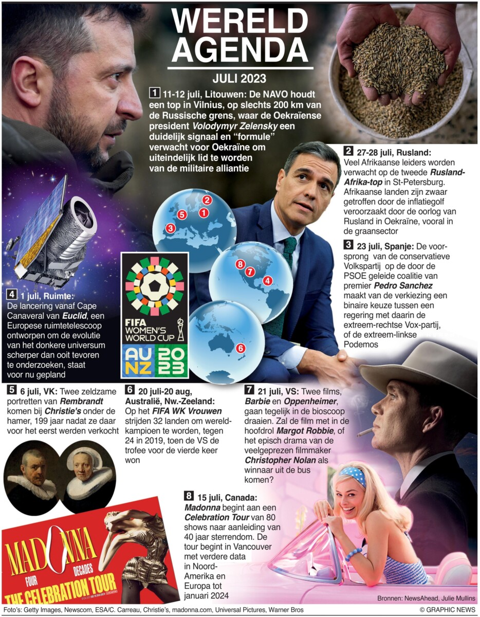 1 juli 2023 – 31 juli 2023 – Evenementen in juli zijn onder meer de NAVO-top in Vilnius, een Rusland-Afrika-top in Sint-Petersburg. algemene verkiezingen in Spanje, de lancering van de Europese ruimtetelescoop Euclid, Madonna’s Celebration Tour en de FIFA Women’s World Cup.