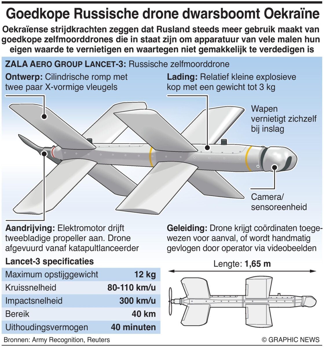 De Lancet-drone, een hoekige grijze buis met twee sets van vier vleugels, vormt volgens Oekraïense soldaten de afgelopen maanden een toenemende bedreiging aan de Oekraïense frontlinies.