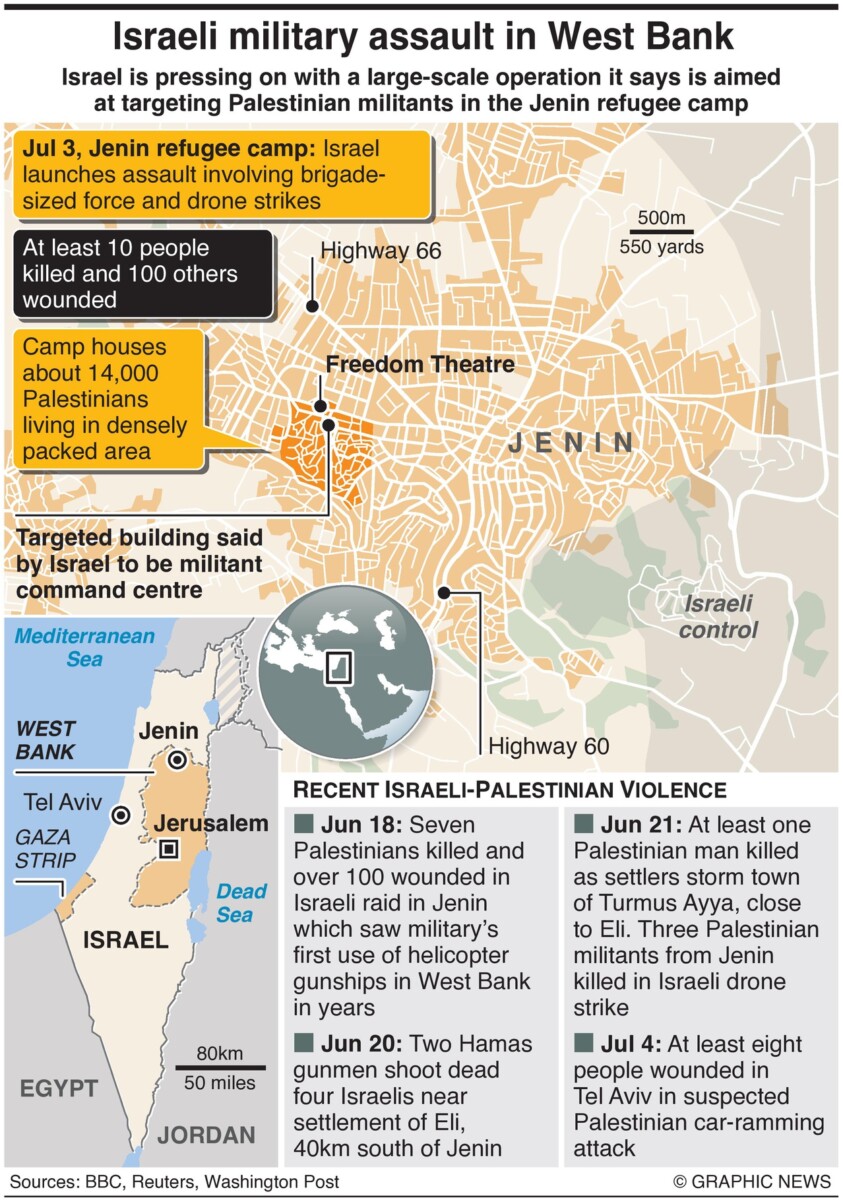 3 juli 2023 – Er zijn IsraĆ«lische drone-aanvallen en vuurgevechten geweest tussen IsraĆ«lische troepen en Palestijnse militanten in Jenin, nadat IsraĆ«l een grote militaire operatie op de Westelijke Jordaanoever was begonnen.