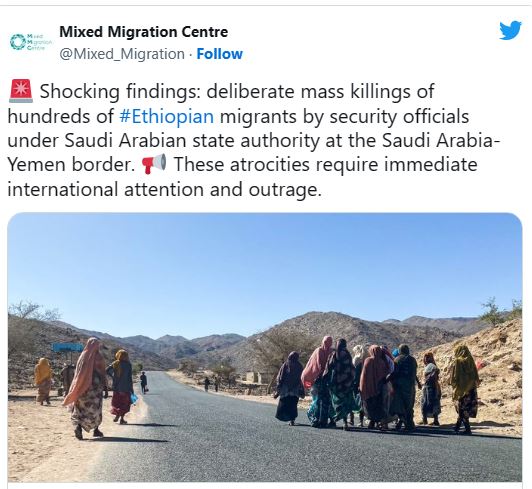 Verschillende organisaties beweren dat Ethiopische arbeidsmigranten worden gedwongen de route tussen al-Jawf en Sadah in Jemen over te steken, waar willekeurige detentie, marteling en seksueel misbruik plaatsvinden en massamoorden worden gepleegd. Medewerkers van de Verenigde Naties, Mixed Migration Centre (MMC) en Mwatana for Human Rights hebben getuigd van de omvang van de moorden en mishandelingen, met het aantal slachtoffers waaronder vrouwen en kinderen. Er is opgeroepen tot onafhankelijk onderzoek, maar er zijn voorlopig geen officiële onderzoeken aangekondigd.