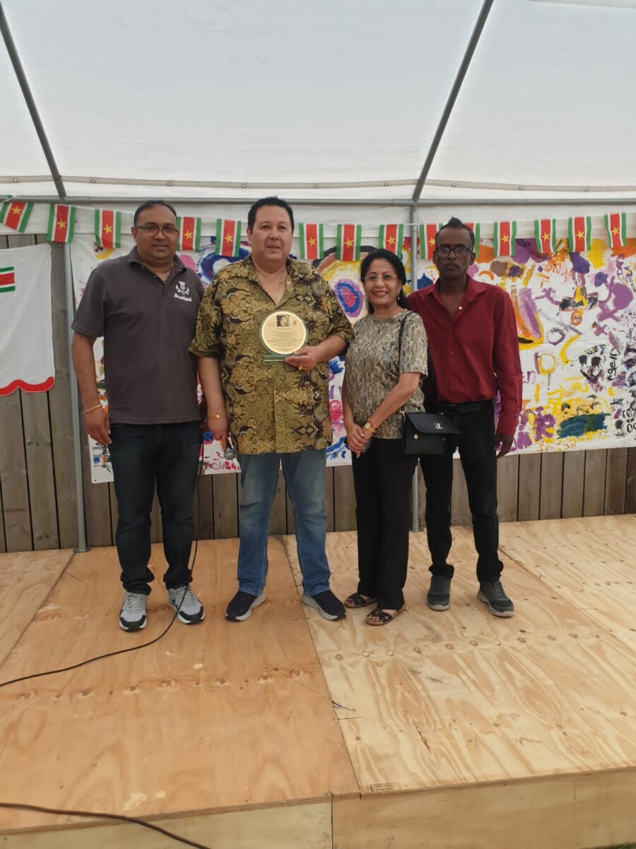 In het kader van 160 jaar Keti Koti heeft Satya Dharma uit Rotterdam-Hoogvliet de heer Steven Amatkarijo gedecoreerd met het SuRo-speldje (Suriname Rotterdam-speldje).