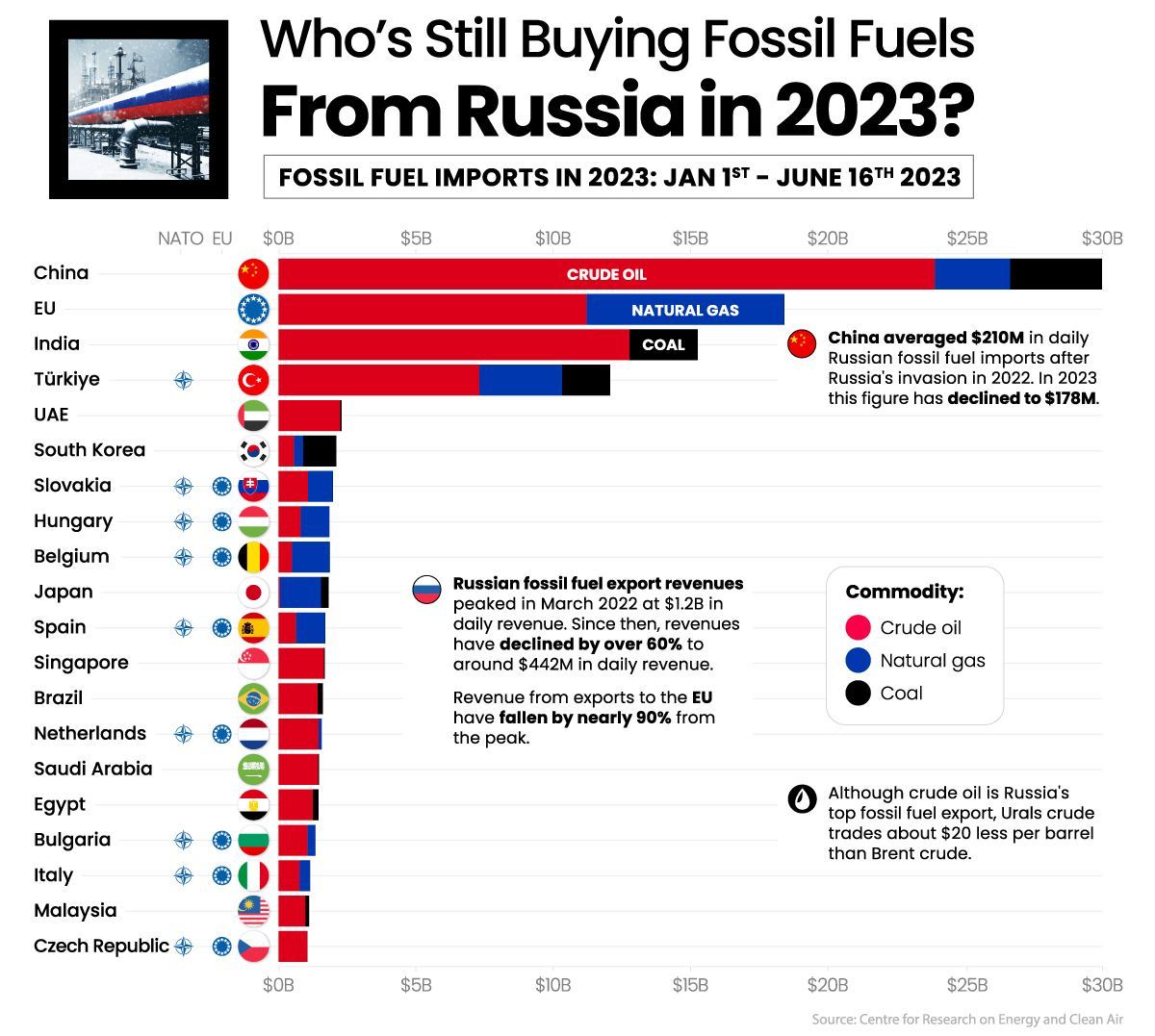 Volgens gegevens van het Centrum voor Onderzoek naar Energie en Schone Lucht (CREA) blijft China de grootste afnemer van fossiele brandstoffen in Rusland, met een invoer van 30 miljard dollar tot en met 16 juni 2023.