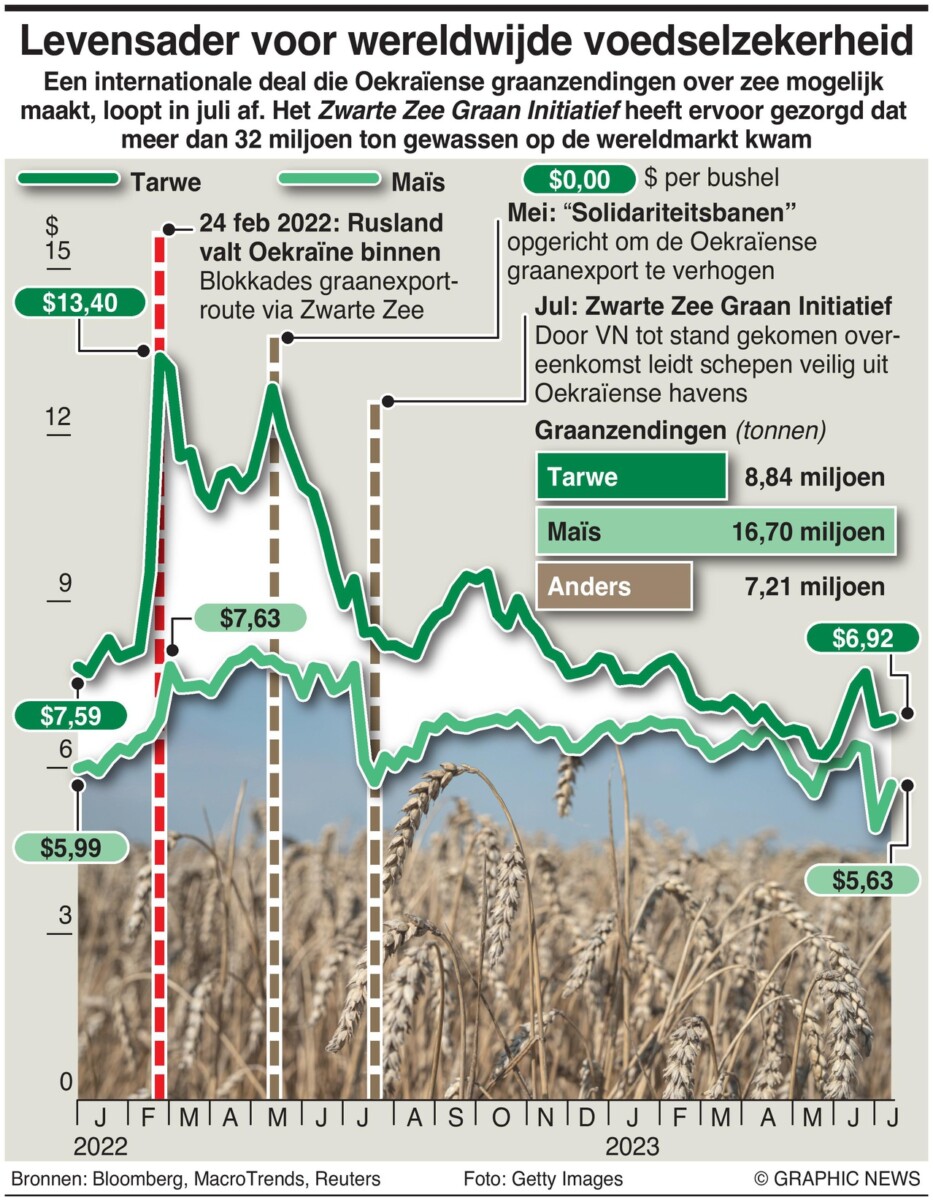 Een internationale deal die het mogelijk maakt dat Oekraïne graan over zee vervoert, loopt in juli af. Dankzij het Black Sea Grain Initiative hebben 32,75 miljoen ton gewassen de wereldmarkten bereikt.