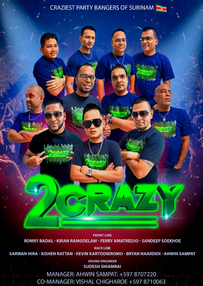 2CRAZY is opgericht op 19 oktober 2019 door Ahwin Sampat. Inmiddels bestaat de groep al bijna 4 jaren. De groep bestaat uit 10 leden ( 5 muzikanten, 4 zangers en 1 geluidsman). Zij zijn meer een party band en spelen verschillende muziekstijlen. 2CRAZY wordt geboekt voor huwelijk, receptie, moendan sanskaar, verjaardagsfeestjes, evenementen ectetera. In oktober 2022 zijn ze naar Guyana geweest en hebben daar ook lokale artiesten uit Guyana en artiesten uit New York en Trinidad mogen begeleiden.