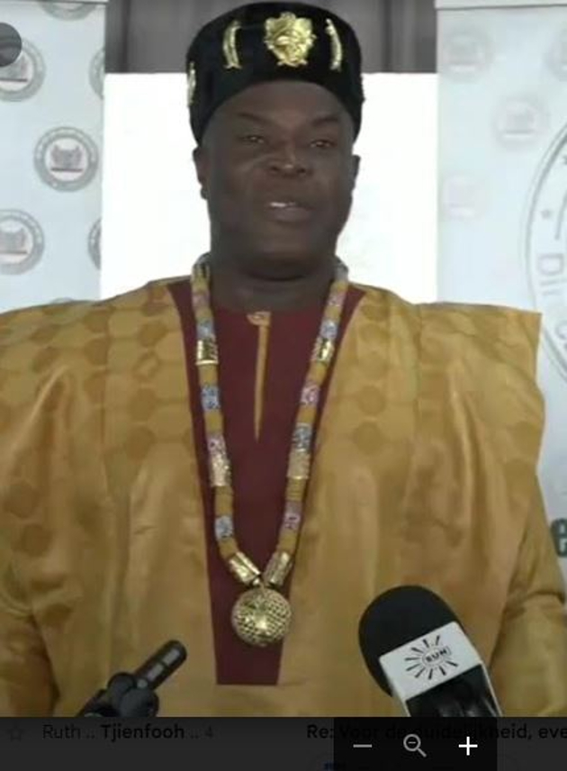 Vicepresident Brunswijk sprak woensdagmorgen de pers voor aanvang van de wekelijkse vergadering van Raad van Ministers. Hij was getooid in een goudkleurig koninklijk Afrikaans gewaad, met een dik gouden halssnoer om zijn hals.