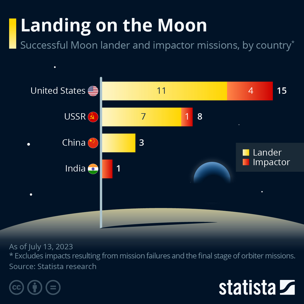India is het enige andere land dat op de maan is geland door middel van een inslag- of landermissie (anderen hebben dit gedaan, maar alleen als de laatste fase van een orbitermissie, neerstortend op het oppervlak met zelfvernietiging als enige doel). Na 312 dagen in een baan om de maan te hebben gedraaid, zette Chandrayaan-1 in november 2008 een maaninslagsonde in, waarbij ondergronds puin vrijkwam dat, na analyse door de orbiter, de aanwezigheid van water bevestigde. De missie zorgde er ook voor dat India als eerste een harde landing maakte op de zuidpool van de maan.