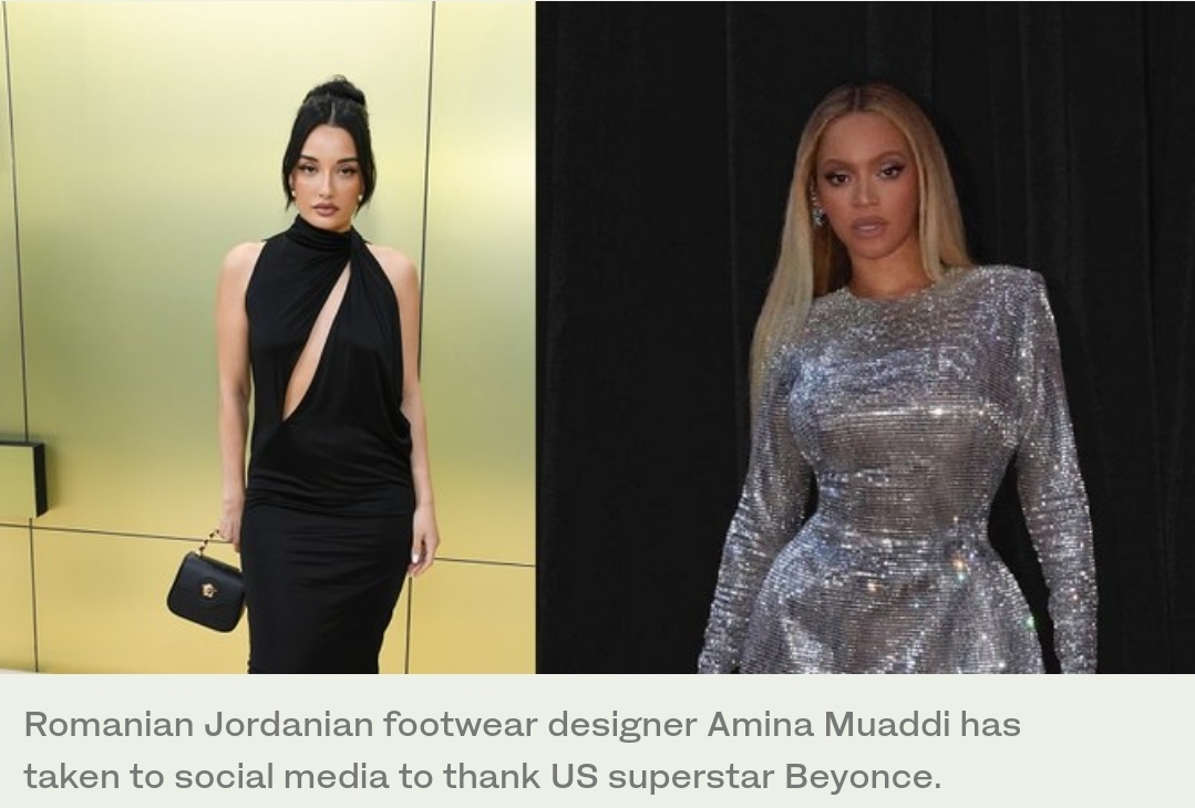 De Roemeense Jordaanse schoenenontwerper Amina Muaddi heeft Beyonce via sociale media bedankt voor het dragen van haar schoenenlijn tijdens haar tournee. Beyonce is meerdere keren op het podium gespot met Muaddi’s creaties. Muaddi is dankbaar voor deze momenten en voelt zich vereerd om deel uit te maken van Beyonce’s tournee. Behalve Beyonce heeft Muaddi ook samenwerkingen gehad met andere beroemdheden en heeft ze verschillende prijzen ontvangen voor haar werk. In 2022 werd ze uitgeroepen tot ontwerper van het jaar bij de FN Achievement Awards.