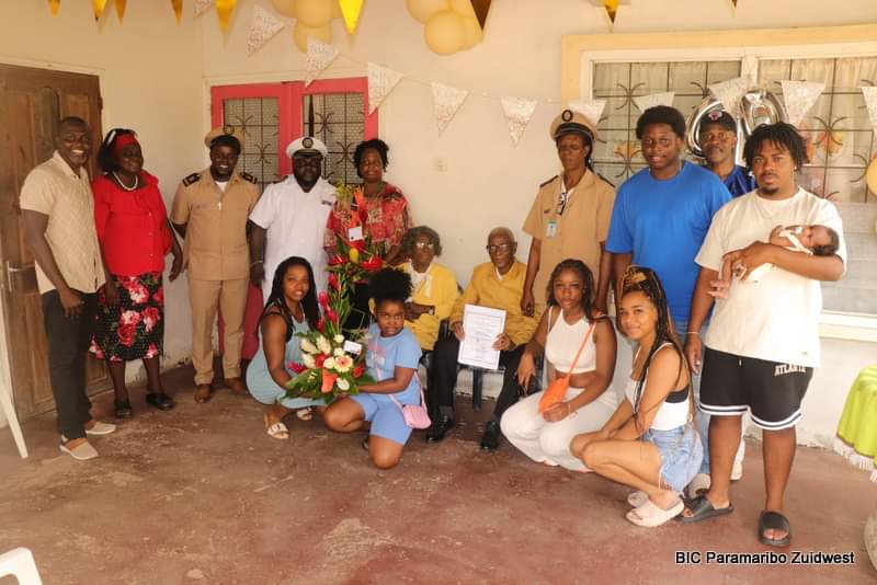 Namens de regering mocht het echtpaar uit handen van vertegenwoordigers van het districtscommissariaat Paramaribo Zuid-West de gebruikelijke enveloppe met inhoud en een oorkonde in ontvangst nemen.