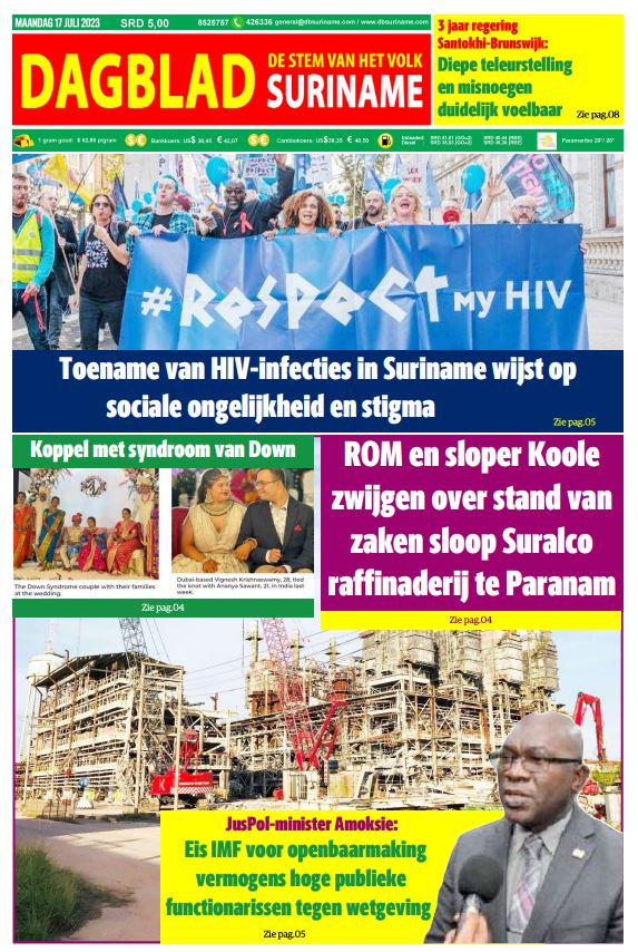 Front pagina -Dagblad Suriname Geplaatst op juli 16, 2023juli 16, 2023 Maandag 17 juli 2023. Dagblad Suriname – Waar het nieuws ECHT is. Bericht navigatie VorigeAuto in de goot na hoge snelheid op weg naar luchthaven.VolgendeViering Franse Nationale Dag in Suriname