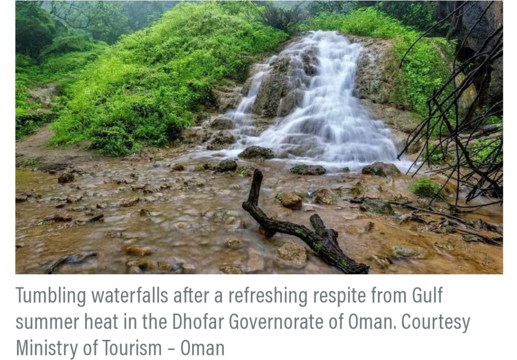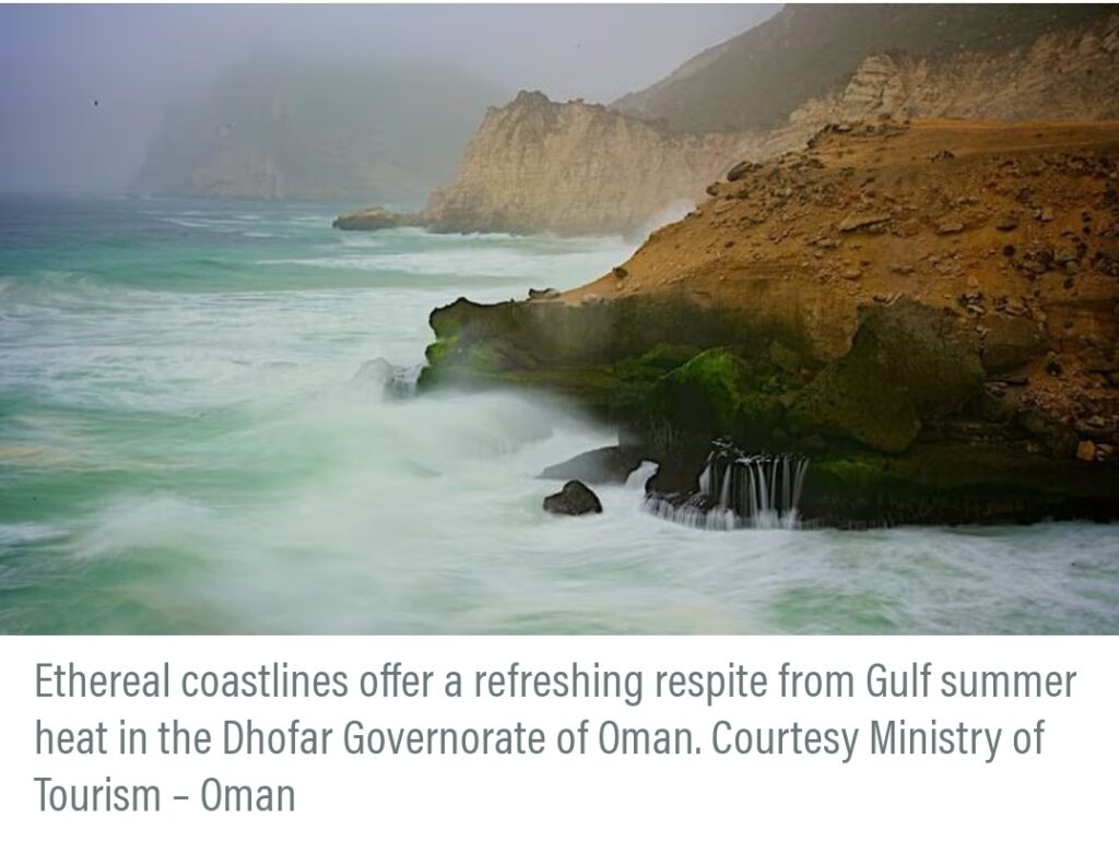 Van juni tot eind september vangt Salalah, mede dankzij het Dhofar-gebergte, een deel van de zuidoostelijke moesson op, die belangrijk is voor de watervoorziening van het gebied het hele jaar door. Terwijl westerse bezoekers in de winter naar Oman trekken voor de zon, betalen Golfreizigers een premie om een paar dagen dikke mist en lichte motregen in de zomer te ervaren, waarbij sommigen meer dan 1000 km van Muscat rijden voor het voorrecht. Hier zijn enkele van de aanbevolen plekken.
