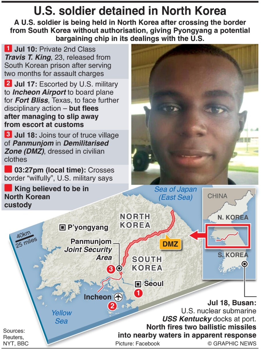 Het Amerikaanse leger doet er alles aan om het lot vast te stellen van soldaat Travis T. King, die op 18 juni Noord-Korea binnenkwam tijdens een oriëntatietour door de Joint Security Area (JSA) op de grens tussen de twee Korea’s.