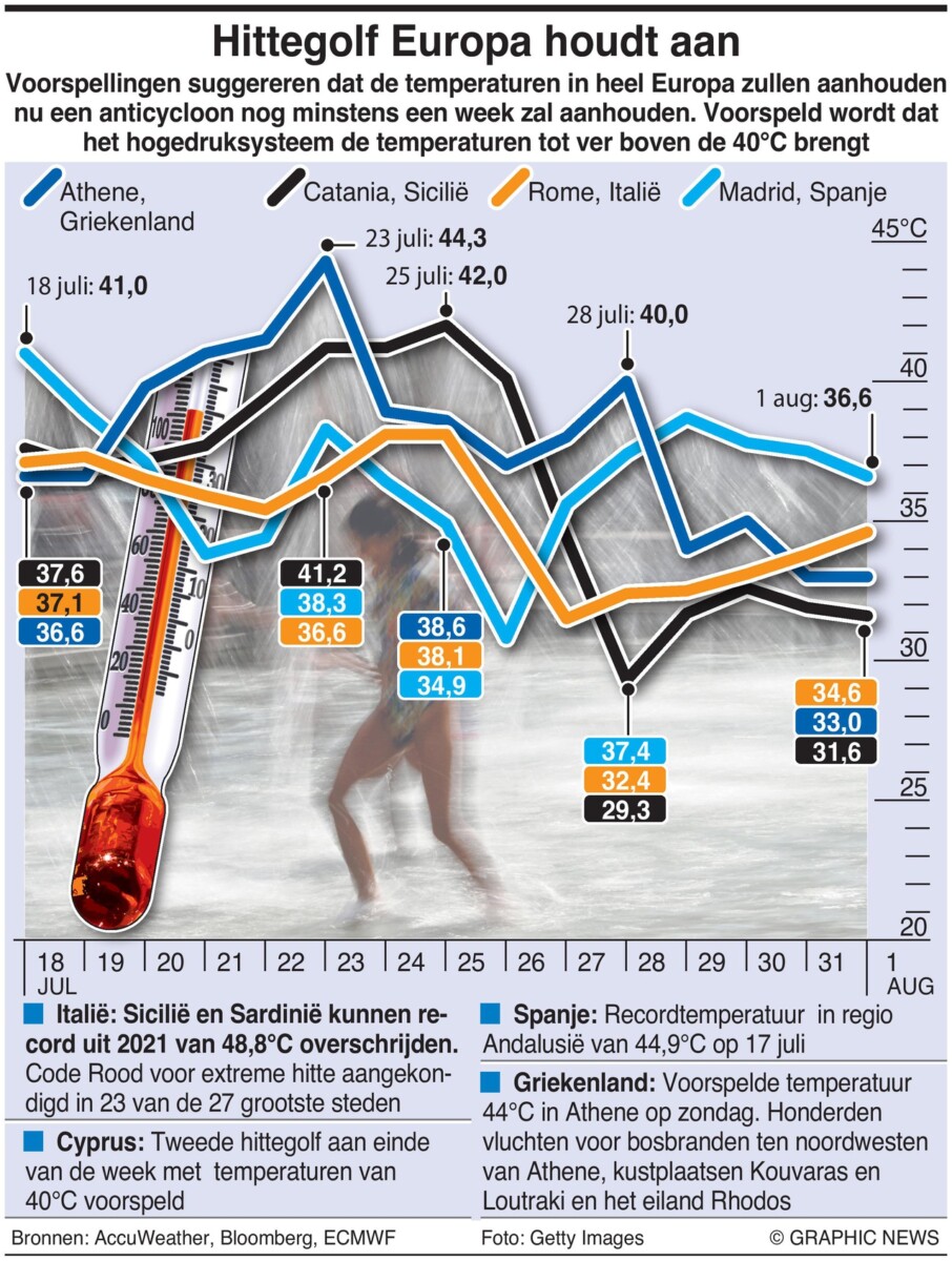 De Wereld Meteorologische Organisatie van de VN (WMO) voorspelt dat de temperaturen in Europa zelfs het record van 48,8°C dat twee jaar geleden op Sicilië werd gevestigd, zouden kunnen breken, aangezien de bezorgdheid toeneemt dat de hitte tot doden zal leiden.