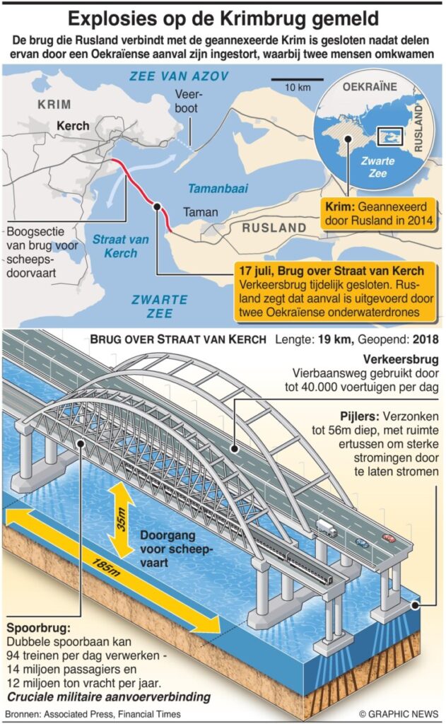 De Britse inlichtingendiensten worden ervan beschuldigd betrokken te zijn geweest bij de drone-aanval op de Krimbrug. Dit wordt gezegd door een Russische diplomaat, Dmitry Polyansky, bij de VN. Het Russische Nationale Antiterroristische Comité beschuldigt Oekraïne van het plegen van een terroristische aanslag op de brug. Hoewel de steunen van de brug niet beschadigd zijn, zijn er wel twee burgers omgekomen en is een deel van de rijbaan ingestort. Polyansky suggereert dat westerse, met name Britse, inlichtingendiensten betrokken waren bij de voorbereiding en uitvoering van de aanval. Het Verenigd Koninkrijk heeft deze beschuldiging ontkend.
