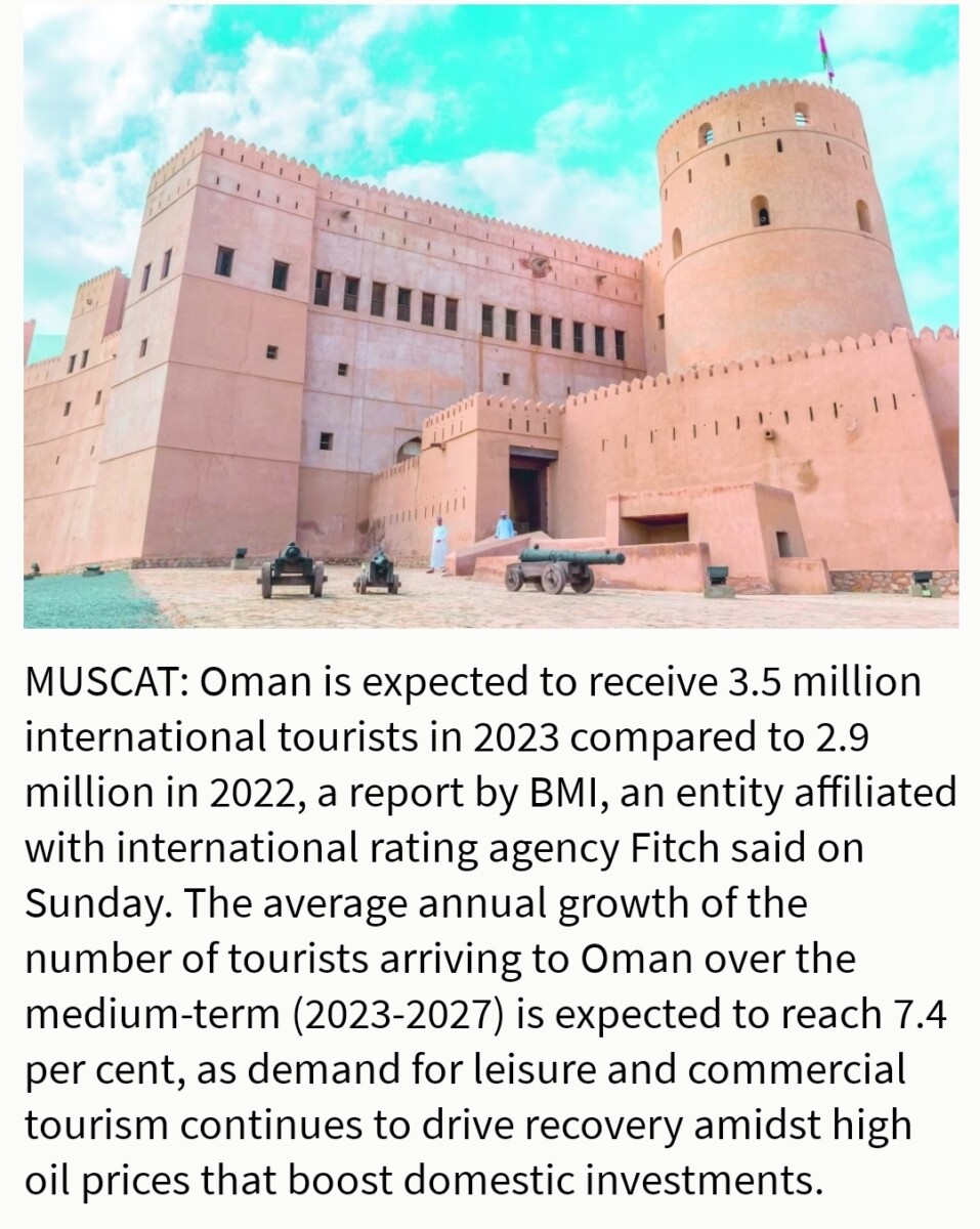 Dit jaar worden er naar verwachting 3,5 miljoen toeristen naar Oman verwacht. Het aantal toeristen in Oman zal naar verwachting op de middellange termijn (2023-2027) met gemiddeld 7,4 procent groeien. Dit wordt gestimuleerd door de vraag naar recreatief en commercieel toerisme, evenals hoge olieprijzen die binnenlandse investeringen stimuleren. Er is een toename van 126,7 procent in het aantal aankomende internationale vluchten naar Oman, wat wijst op een groeiend aantal inkomende toeristen.