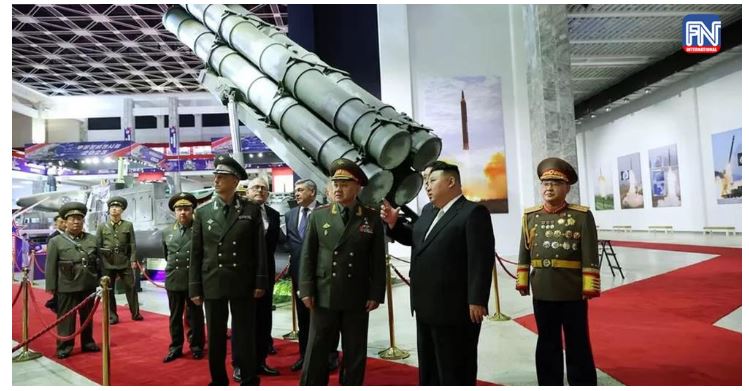 Kim Jong-un heeft woensdag de nieuwste wapens van Noord-Korea getoond aan de Russische defensiechef Sergei Shoigu. Dit gebeurde tijdens een viering van de 70e verjaardag van de Koreaanse oorlog, gekenmerkt door massale militaire parades. De getoonde wapens omvatten een intercontinentale ballistische raket (ICBM) en twee nieuwe drone-ontwerpen. Het bezoek komt te midden van beschuldigingen dat Noord-Korea Rusland van wapens voorziet voor de oorlog in Oekraïne, wat beide landen ontkennen. Kim en Shoigu bespraken onderwerpen van wederzijds belang met betrekking tot nationale defensie en internationale veiligheid. Zowel Rusland als China zijn al lange tijd bondgenoten van Noord-Korea.