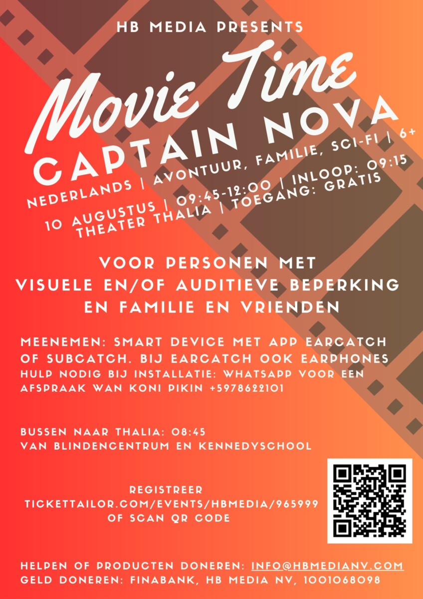 HB Media organiseert 10 augustus het event Movie Time voor kinderen en volwassenen met een visuele en/of auditieve beperking samen met familie en vrienden. Om 9:45 uur wordt de film Captain Nova vertoond in theater Thalia, inloop is vanaf 9:15 uur.