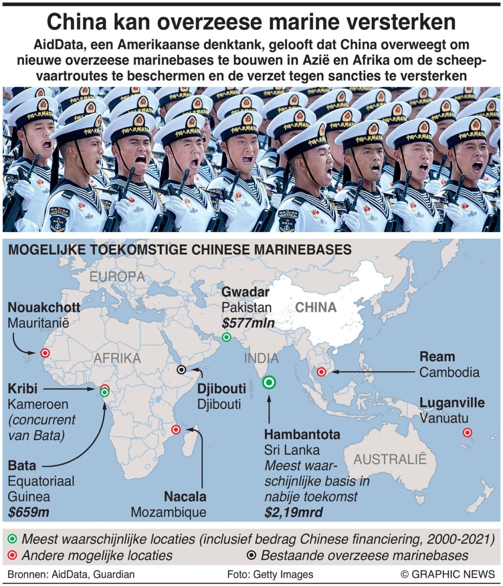 AidData, een in de VS gevestigde denktank, gelooft dat China overweegt om nieuwe overzeese marinebases in Azië en Afrika te bouwen om de scheepvaartroutes te beschermen en de weerstand tegen sancties te versterken.