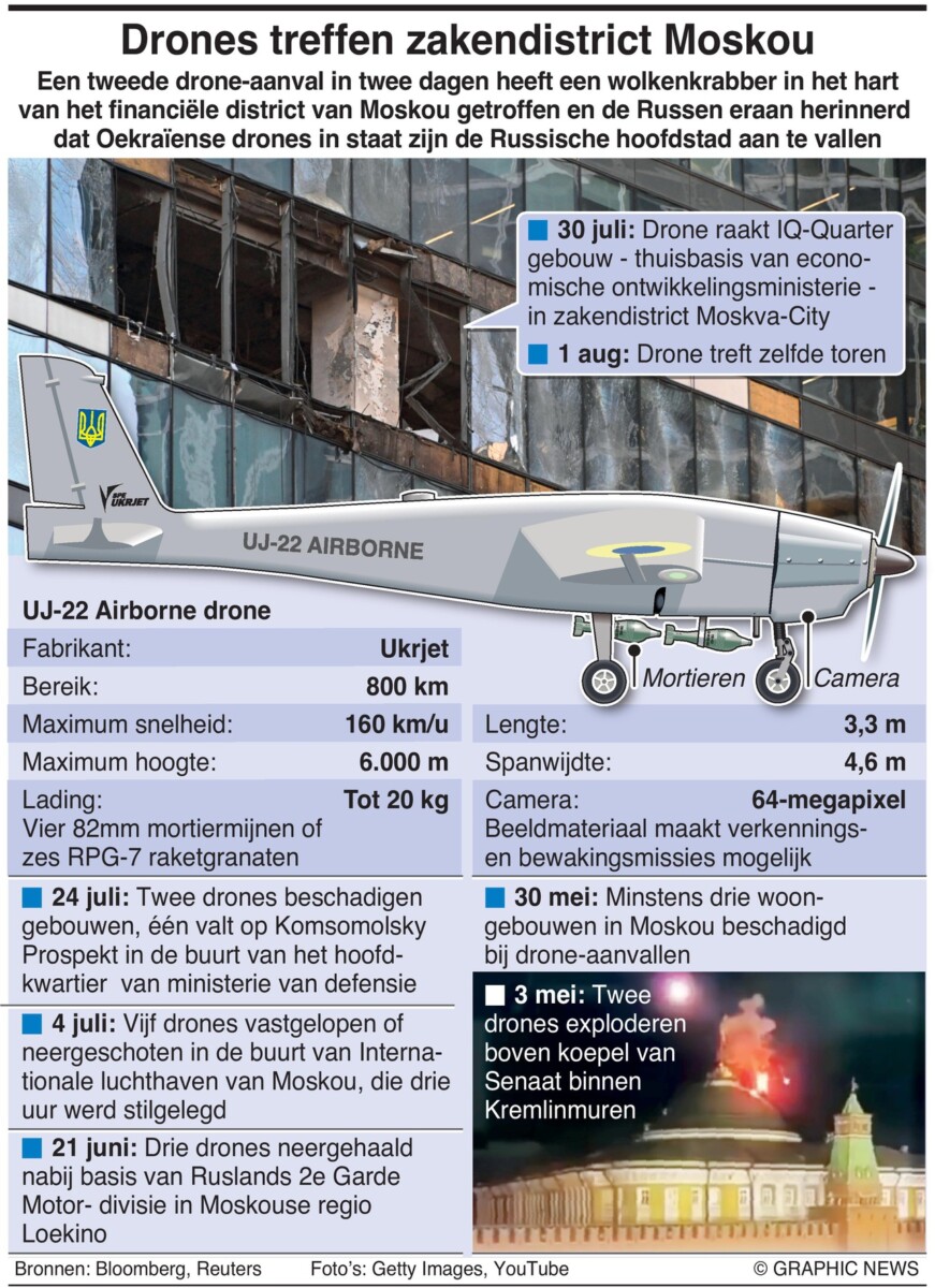 Het Russische ministerie van Defensie zei in de vroege uren van dinsdag (1 augustus) dat het twee Oekraïense drones buiten Moskou had neergeschoten en een ander blokkeerde, waardoor het tegen de 230.000 vierkante meter grote wolkenkrabber botste en de gevel van het gebouw beschadigde.