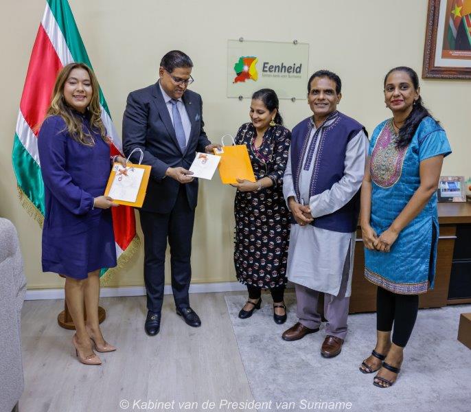 President Chandrikapersad Santokhi en first lady Mellisa Santokhi-Seenacherry hebben dinsdag 1 augustus elk op het Kabinet van de President een exemplaar van een jubileumboek over 150 jaar Hindoestaanse Immigratie in ontvangst mogen nemen.