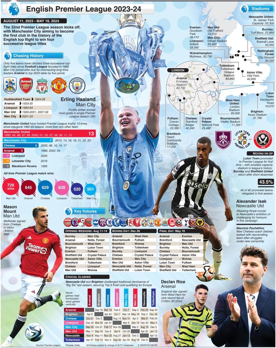 11 augustus 2023 – 19 mei 2024 – Het 32e Premier League-seizoen gaat van start, met Manchester City als doel om de eerste club in de geschiedenis van de Engelse topklasse te worden die vier opeenvolgende landstitels wint.