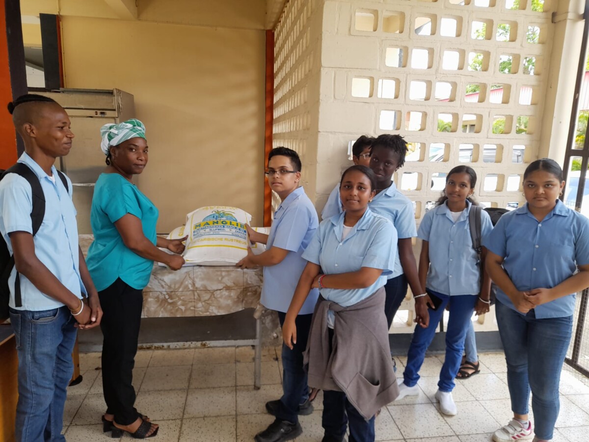 Leerlingen leerjaar 9 van het MULO Geyersvlijt hebben 31 juli een bezoek aan de senioren van Huize Ashiana. Vertegenwoordigd door de 13-jarige leerling, Shakeel Dahoe, hebben de leerlingen twee zakken rijst geschonken.