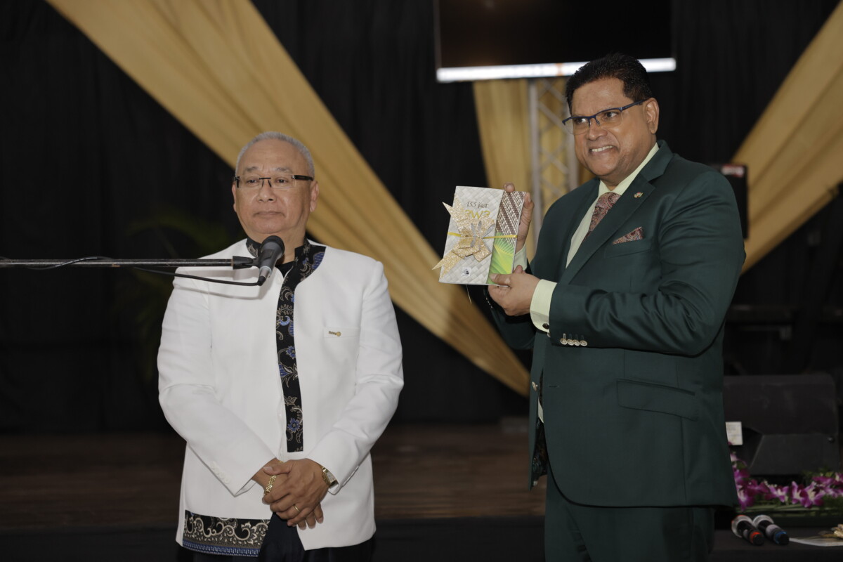 President Santokhi kreeg het eerste exemplaar van het boek “133 Jawa Suriname” uit handen van Elwin Atmodimedjo, voorzitter van de VHJI. Ook Onderwijs, Wetenschap en Cultuur-minister Henry Orie mocht een boek in ontvangst nemen.