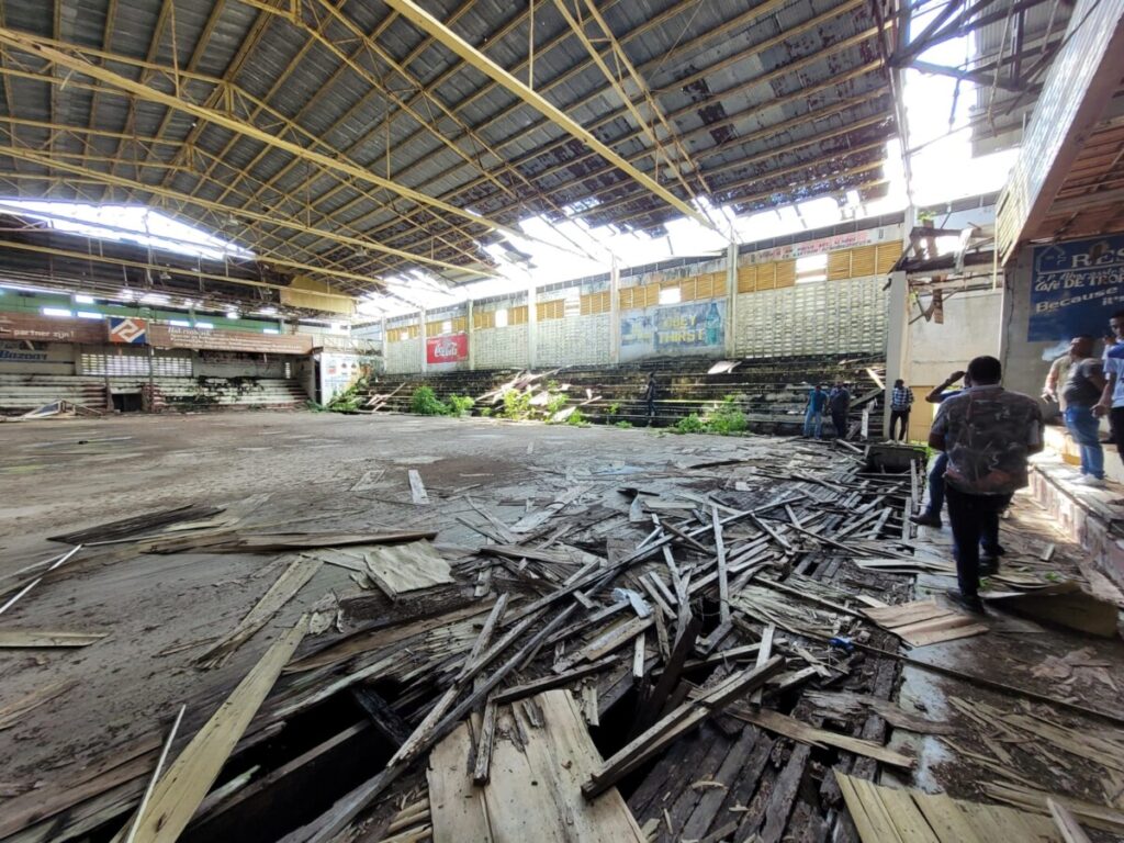 De trieste en troosteloze aanblik binnen in het Nickerie Indoor Stadion.