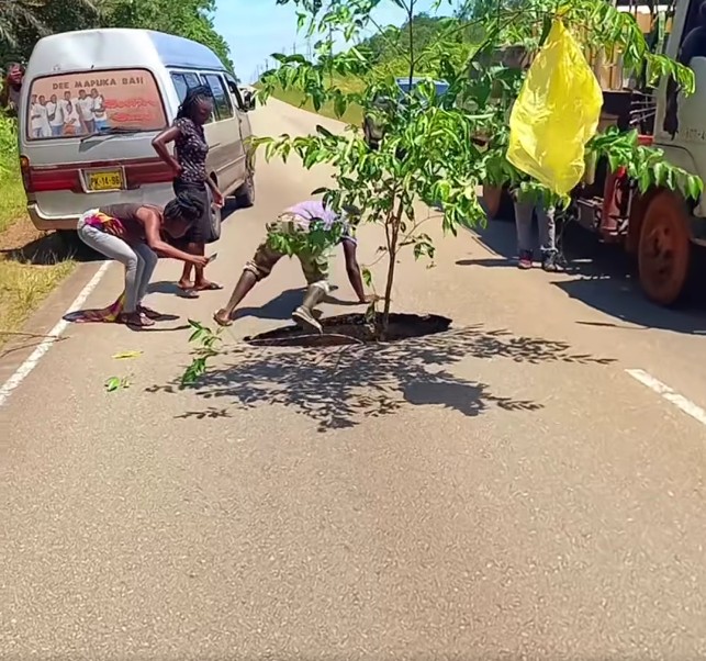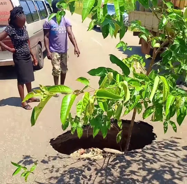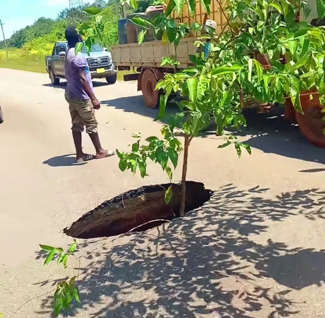 Oplettende en zeer attente weggebruikers waarschuwen via social media weggebruikers voor een groot gat in het wegdek van de Afobakaweg, tussen mast 90 en 91. Beelden van het gat worden gedeeld op Facebook.