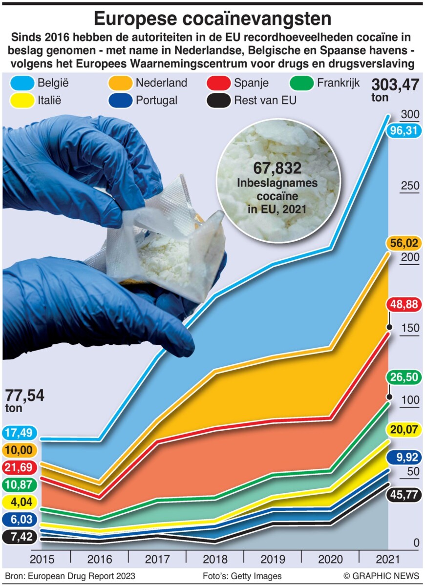 In de Rotterdamse haven onderschepte de Nederlandse politie nog eens 52,5 ton, aldus het Europees Waarnemingscentrum voor Drugs en Drugsverslaving.