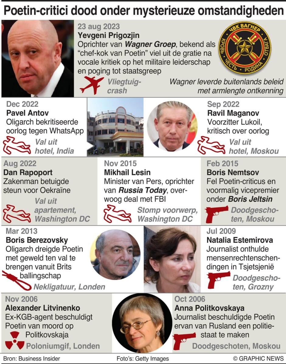 August 24, 2023 – De dood van het hoofd van de Wagner-groep, Yevgeny Prigozhin, waarvan zijn aanhangers beweren dat het een moord door het Kremlin betreft, volgt een patroon van mysterieuze sterfgevallen onder de critici van Vladimir Poetin.