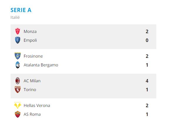 Met deze resultaten staan Milan en Verona aan de top van de Serie A, met beide ploegen zes punten uit twee wedstrijden.