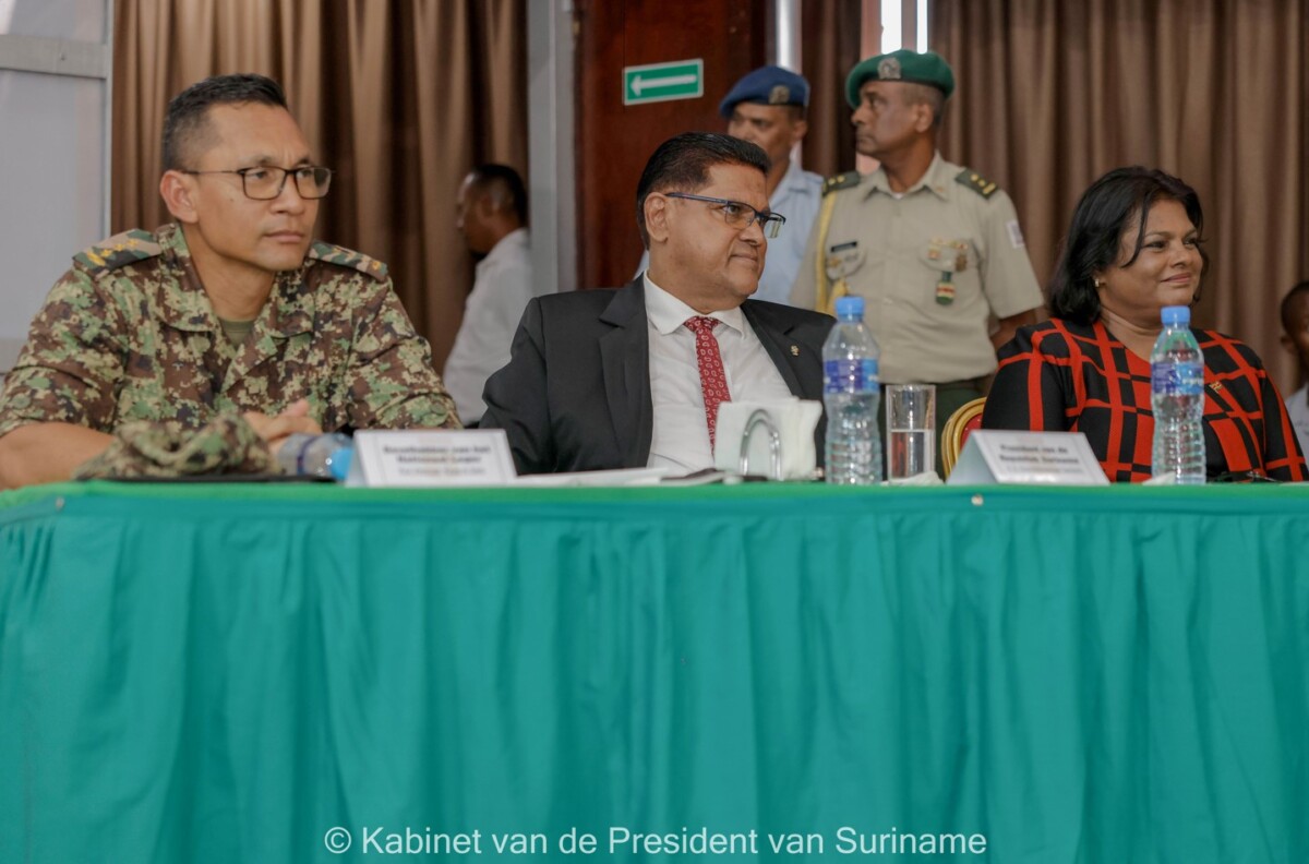 “We hebben niet alleen de klimaatdreiging, maar leunen ook aan tegen een maritieme dreiging vanwege de ontwikkelingen op het gebied van olie en gas. Daarnaast zijn er ook economische, veiligheids- en gezondheidsdreigingen. Ook mensenhandel, mensensmokkel en grensoverschrijdende criminaliteit vragen om een goed antwoord vanuit onze veiligheidsdiensten.” Woorden van president Chandrikapersad Santokhi dinsdag 29 augustus bij de afsluiting van het leiderschapssymposium van het Nationaal Leger (NL) in de Congreshal.