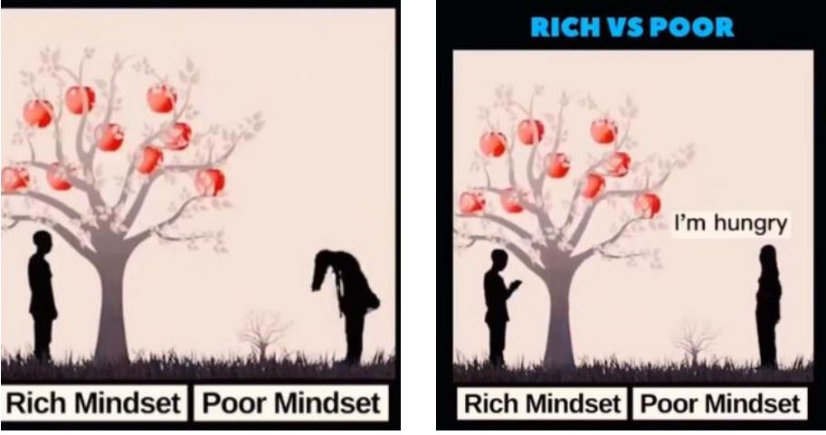 2. Aan de andere kant hebben we de arme mentaliteit. Deze mentaliteit bouwt onbewust muren op, is bang voor het onbekende en vermijdt risico’s ten koste van alles. In plaats van tegenslagen als tijdelijk te beschouwen, behandelen ze ze als onoverkomelijke barrières, die hun vooruitgang belemmeren en hen in een cyclus van stagnatie opsluiten.