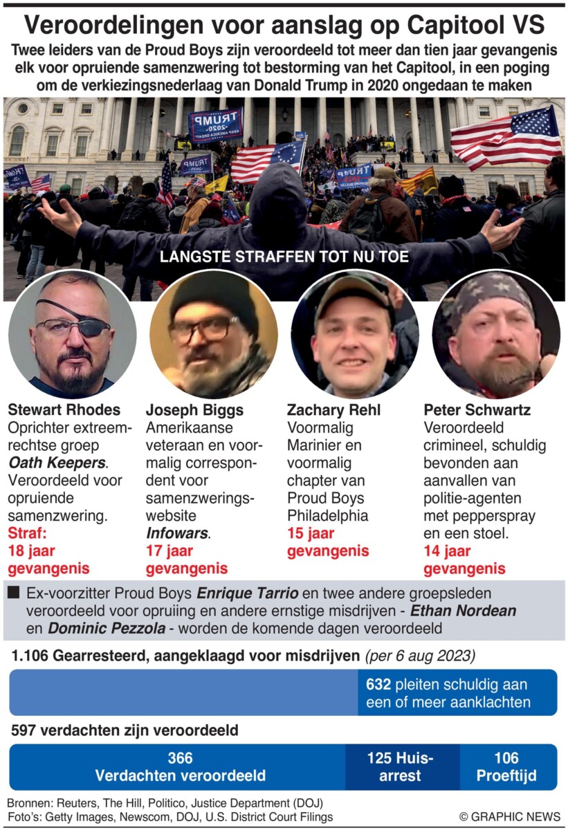 September 1, 2023 – Twee Proud Boys-leiders zijn veroordeeld tot elk meer dan tien jaar gevangenisstraf nadat ze zijn veroordeeld wegens opruiende samenzwering voor het bestormen van het Capitool, in een poging de verkiezingsnederlaag van Donald Trump in 2020 ongedaan te maken.