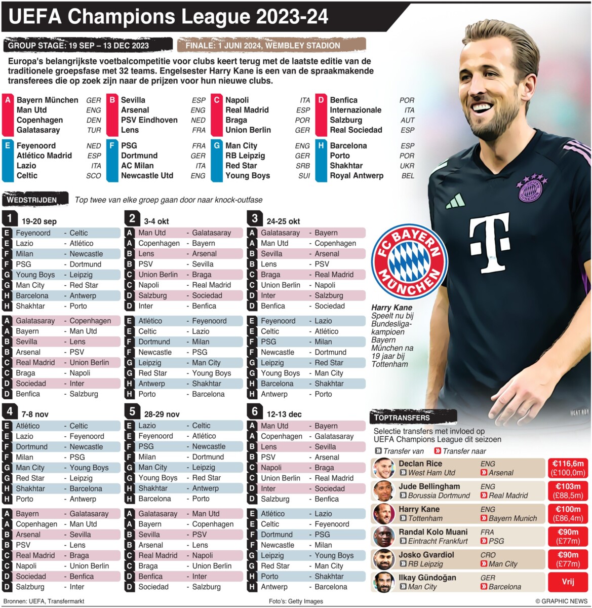 19 september 2023 – 13 december 2023 – Europa’s belangrijkste clubvoetbalcompetitie, de UEFA Champions League, keert terug met de laatste editie van het traditionele groepsfaseformaat met 32 teams. De Engelse ster Harry Kane behoort tot een aantal spraakmakende transferees die zich richten op zilverwerk voor hun respectievelijke nieuwe clubs.