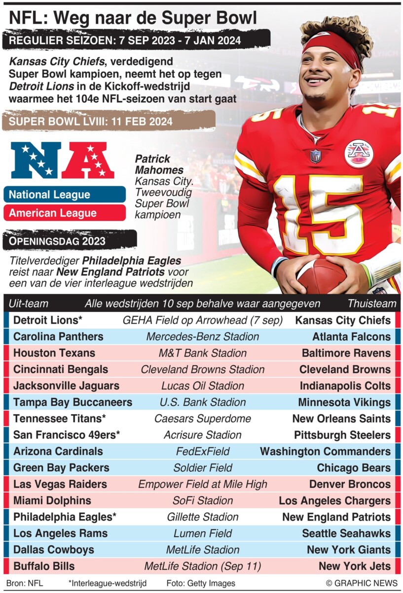 7 september 2023 – 11 september 2023 – Openingswedstrijden van het seizoen 2023 van de National Football League (NFL). De Kansas City Chiefs, die de Super Bowl-kampioenen verdedigen, nemen het op tegen de Detroit Lions in de Kickoff Game waarmee het 104e NFL-seizoen op 7 september wordt gelanceerd, terwijl de resterende wedstrijden van 10 tot en met 11 september worden gespeeld.