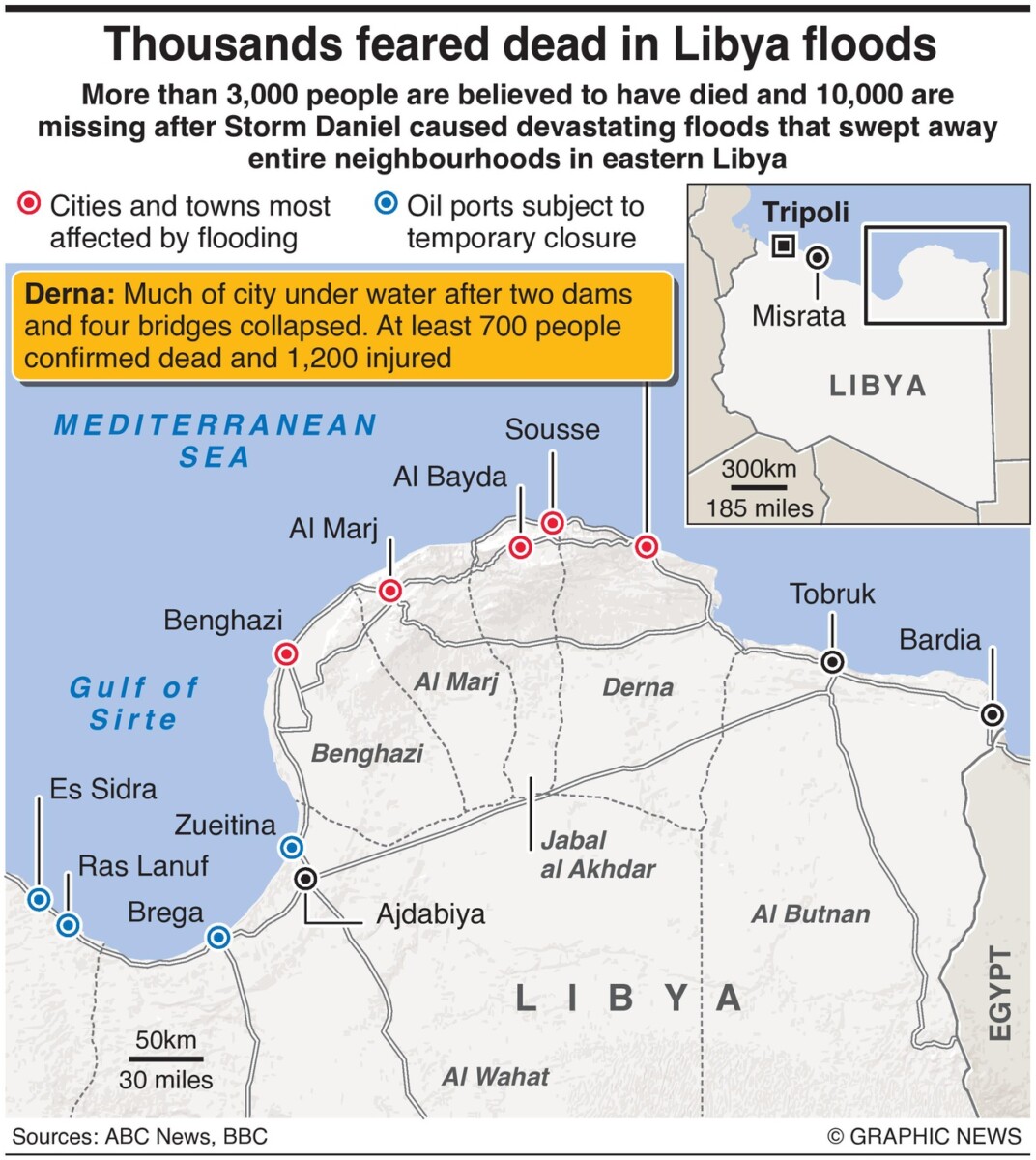 Dit olierijke Noord-Afrikaanse land is nog steeds bezig met herstel na jaren van oorlog en chaos die volgden op de door de NAVO gesteunde opstand in 2011, waarbij de voormalige dictator Moammar Gaddafi werd afgezet en gedood. Momenteel is Libië verdeeld tussen twee rivaliserende regeringen: de door de VN bemiddelde, internationaal erkende regering in Tripoli in het westen, en een afzonderlijke regering in het oostelijke gebied dat is getroffen door de overstromingsramp.