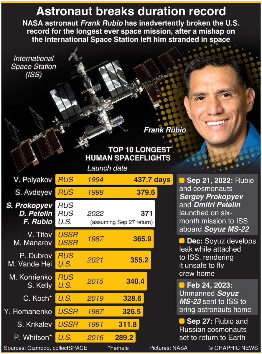 Op 11 september 2023 brak NASA-astronaut Frank Rubio per ongeluk het Amerikaanse record voor de langste ruimtemissie ooit.