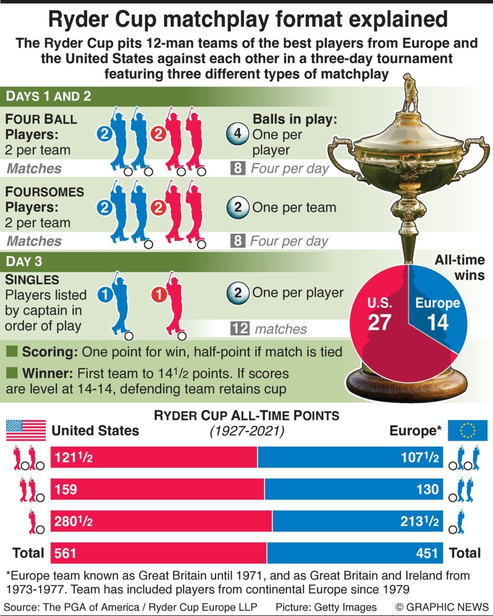 Bij de Ryder Cup nemen de twaalf beste spelers uit de VS het op tegen de twaalf beste spelers uit Europa in een driedaagse competitie. Tijdens de eerste twee dagen wordt er zowel een vierbalsessie als een viertalsessie gespeeld. Op de slotdag van de wedstrijd worden 12 enkelspelwedstrijden gespeeld.