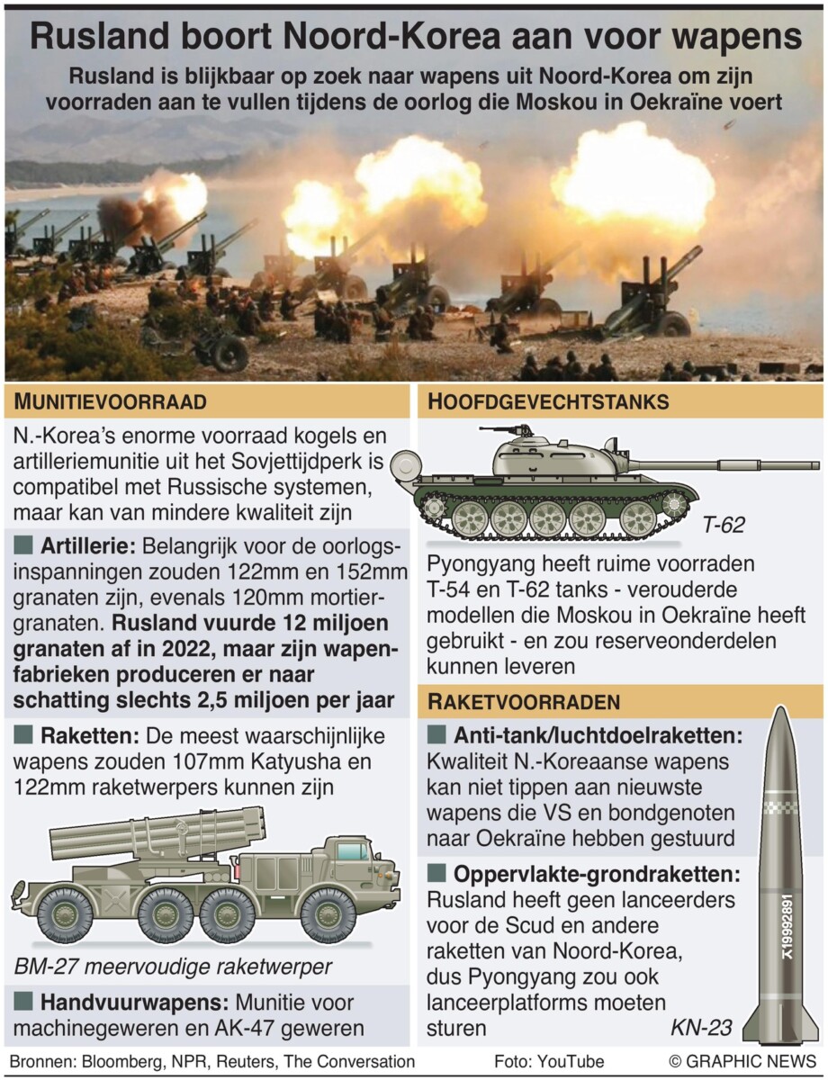 Terwijl Pyongyang en Moskou de Amerikaanse beschuldigingen van wapenoverdrachten hebben ontkend, beschikt Noord-Korea over enkele van de grootste voorraden artillerie en ongeleide raketten die kunnen worden gebruikt in de wapens uit het Sovjettijdperk die Rusland gebruikt om willekeurige aanvallen op Oekraïne uit te voeren, aldus Bloomberg.