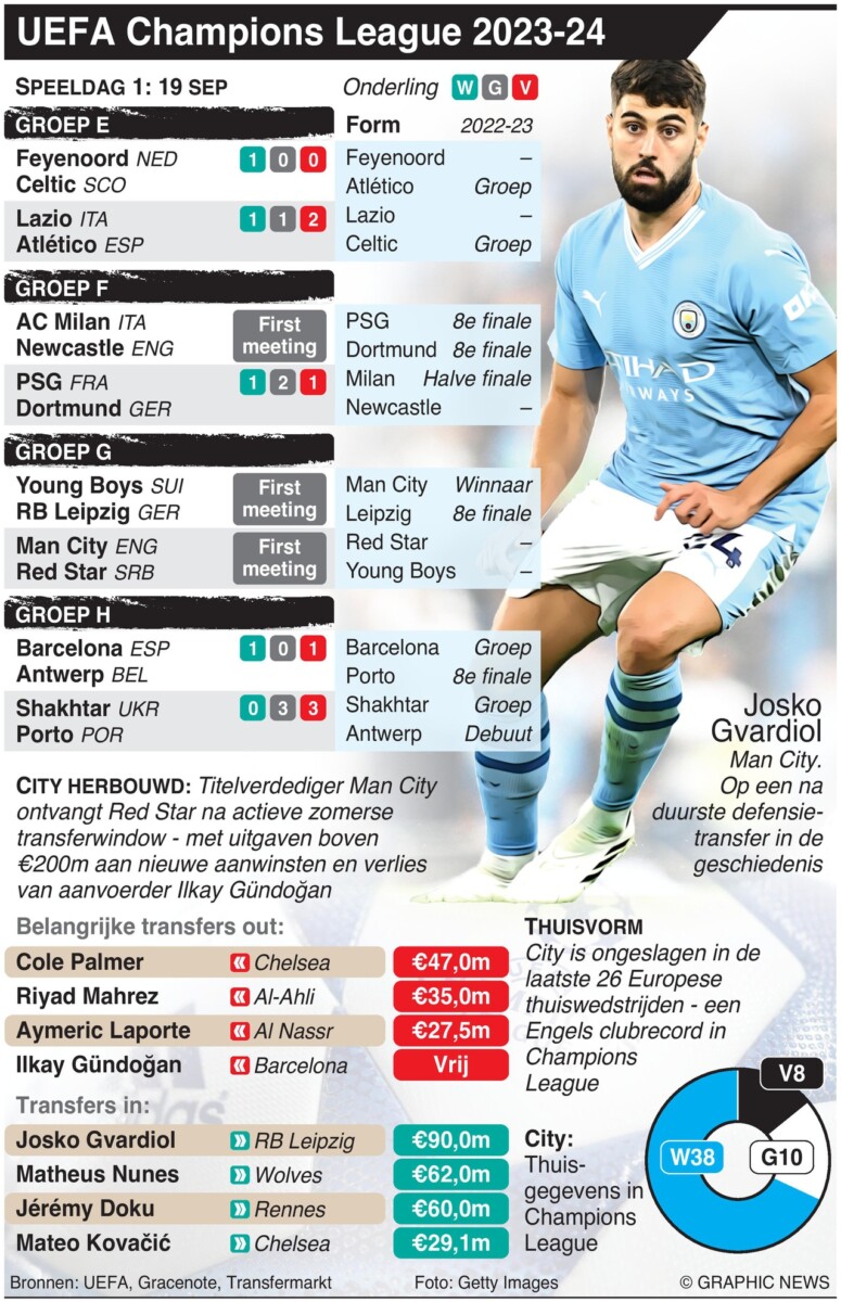 19 september 2023 – Europa’s nieuwe UEFA Champions League-seizoen begint op 19 september en culmineert in de finale in het Londense Wembley Stadion op 1 juni 2024. Belangrijke wedstrijden zijn onder meer titelverdediger Manchester City, met een zomercontract van €90 miljoen voor Josko Gvardiol, die het opneemt tegen Red Star, PSG gastheer van een zwaargewichtduel met Dortmund, en Newcastle United reist af naar AC Milan.