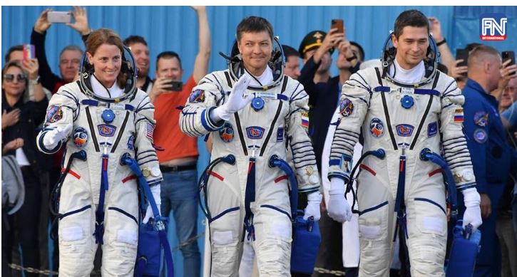 Russisch ruimtevaartuig met twee kosmonauten en Amerikaanse astronaut landen in de ruimte