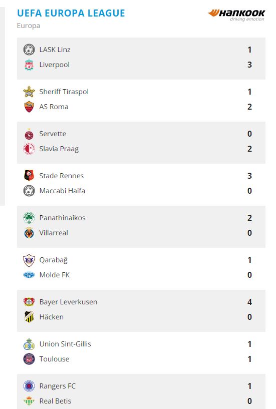 In andere Europa League-wedstrijden won Roma met 2-1 van Sheriff in Moldavië, terwijl Rangers Real Betis met 1-0 versloegen in Glasgow. Bayer Leverkusen versloeg Hacken uit Zweden met 4-0, Rennes versloeg Maccabi Haifa met 3-0 in Frankrijk, en Villarreal verloor met 2-0 van Panathinakos in Griekenland.