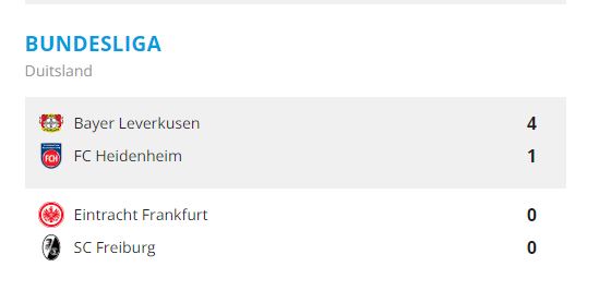 In de Bundesliga behoudt titelkandidaat Leverkusen zijn koppositie ondanks een nederlaag tegen nieuwkomers Heidenheim. Victor Boniface, een slimme aanwinst voor Leverkusen, scoorde een indrukwekkend openingsdoelpunt. Heidenheim maakte na de pauze gelijk, maar Leverkusen herstelde snel met een doelpunt van Jonas Hofmann. Een strafschop en een laatste doelpunt van Amine Adli resulteerden in een 4-1 overwinning voor Leverkusen. Het team van coach Xabi Alonso heeft nu vier overwinningen behaald in de Bundesliga en blijft een belangrijke uitdager voor Bayern München, dat op doelsaldo bovenaan staat. In de late zondagwedstrijd eindigde Eintracht Frankfurt tegen Freiburg in een doelpuntloos gelijkspel, ondanks Frankfurt’s ongeslagen status en sterke verdediging. Frankfurt heeft echter de laatste vier wedstrijden gelijkgespeeld en blijft zonder overwinning sinds de openingsdag van het seizoen.
