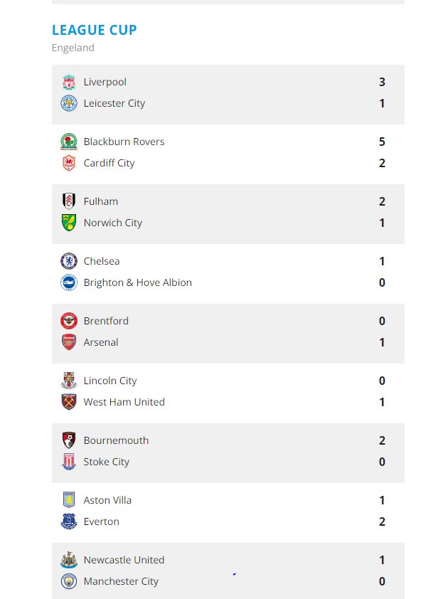 Verder won Everton met 2-1 van Aston Villa, West Ham versloeg Lincoln met 1-0, Fulham versloeg Norwich met 2-1 en Bournemouth won met 2-0 van Stoke. Blackburn was de hoogste scorer van de avond met een 5-2 overwinning op Cardiff in een all-Championship-duel.