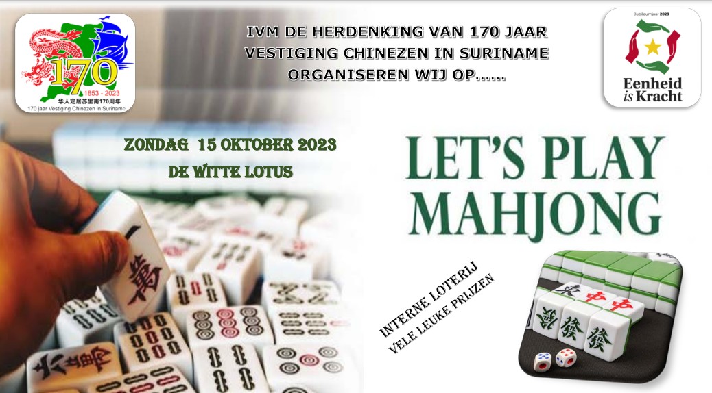 In het kader van de herdenking van 170 jaar vestiging van Chinezen in Suriname organiseert de Nationale Commissie Jubileumjaren 2023 (NCJ) in samenwerking met de Lions Club Paramaribo North een Mahjong Drive op 15 oktober bij de zwemvereniging De Witte Lotus. Deelnemers kunnen tegen betaling deelnemen aan dit authentieke Chinese gezelschapsspel, waarvan de opbrengst bestemd is voor een goed doel.