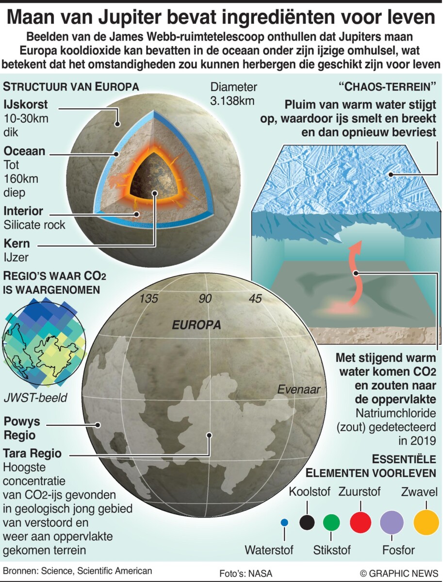 Beelden van de James Webb-ruimtetelescoop laten zien dat Jupiters maan Europa mogelijk koolstofdioxide in de oceaan vasthoudt onder zijn ijskoude omhulsel, wat betekent dat er omstandigheden kunnen zijn die geschikt zijn voor leven.