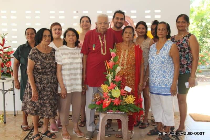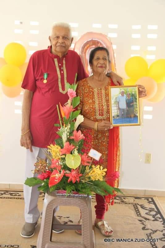 Op Vrijdag 28 september vierden het echtpaar Makhanlal – Adhin te midden van hun kinderen, families en vrienden het heugelijk feit dat ze 60 diamantenjaren samen heben doorgebracht. Zo een mijlpaal mag niet onopgemerkt voorbijgaan, dus werd het feestelijk afgesloten met ook nog bezoek van regeringsvertegenwoordigers, die de felicitaties namens de regering overbrachten: Namens de Districtscommissaris, gingen Districtssecretaris, de heer Stephen Dompig, de Adjunct Districtssecretaris, mevrouw Ravenna Sanches en van afdeling ICT en collega. Op 8 oktober 1938, zag de heer, Chaterpal Henry Makhanlal, het levenslicht te Paramaribo. Voor ongeveer 36 jaren was de heer Makhanlal verbonden als hulpkracht in de apotheek bij het ministerie van Volksgezondheid. In die tussen tijd behaalde hij ook nog zijn verpleegkkundige opleiding. In 1974 besloot hij naar Nederland te vertrekken en werkte in het ziekenhuis in Rijswijk. Hij kwam terug naar Suriname en werkte bij de Regionale Gezondheidsdienst tot zijn pensionering. Voor ongeveer 6 jaren heeft hij gewerkt bij de Pan American Health Organization als stafmedewerker. Vanwege zijn bijzondere verdiensten en prestaties bij de PAHO belast als coördinator van de eerste landelijke gele koorts campagne werd hij gedecoreerd tot Ridder in de Ere Orde van de Palm. In het jaar 1945, en wel op 2 Mei zag mevrouw Yvonne Kamlawatie Adhin, het levenslicht te Paramaribo. Het huwelijk van het bruidspaar is gearrangeerd door wederzijdse ouders. Uit het huwelijk zijn er 4 kinderen voortgekomen, waarvan 3 dochters en 1 zoon. Ook zijn zij rijk aan 4 kleinkinderen en 1 achterkleinkind. Het echtpaar beleid het Hindoeïsme en bezoekt de Shri Vishnu Mandir. Als hoogte punt geeft het bruidspaar aan, super trots te zijn dat hun kroost goed terecht is gekomen en genieten zij van hun kleinkinderen. Uit handen van de Districtssecretaris mocht het diamantenpaar een bloemstuk, een felicitatie kaart en een ingelijste foto in ontvangst nemen. De middelen die bij zo een jubileum horen worden overgemaakt op een opgegeven bankrekeningnummer van het echtpaar.