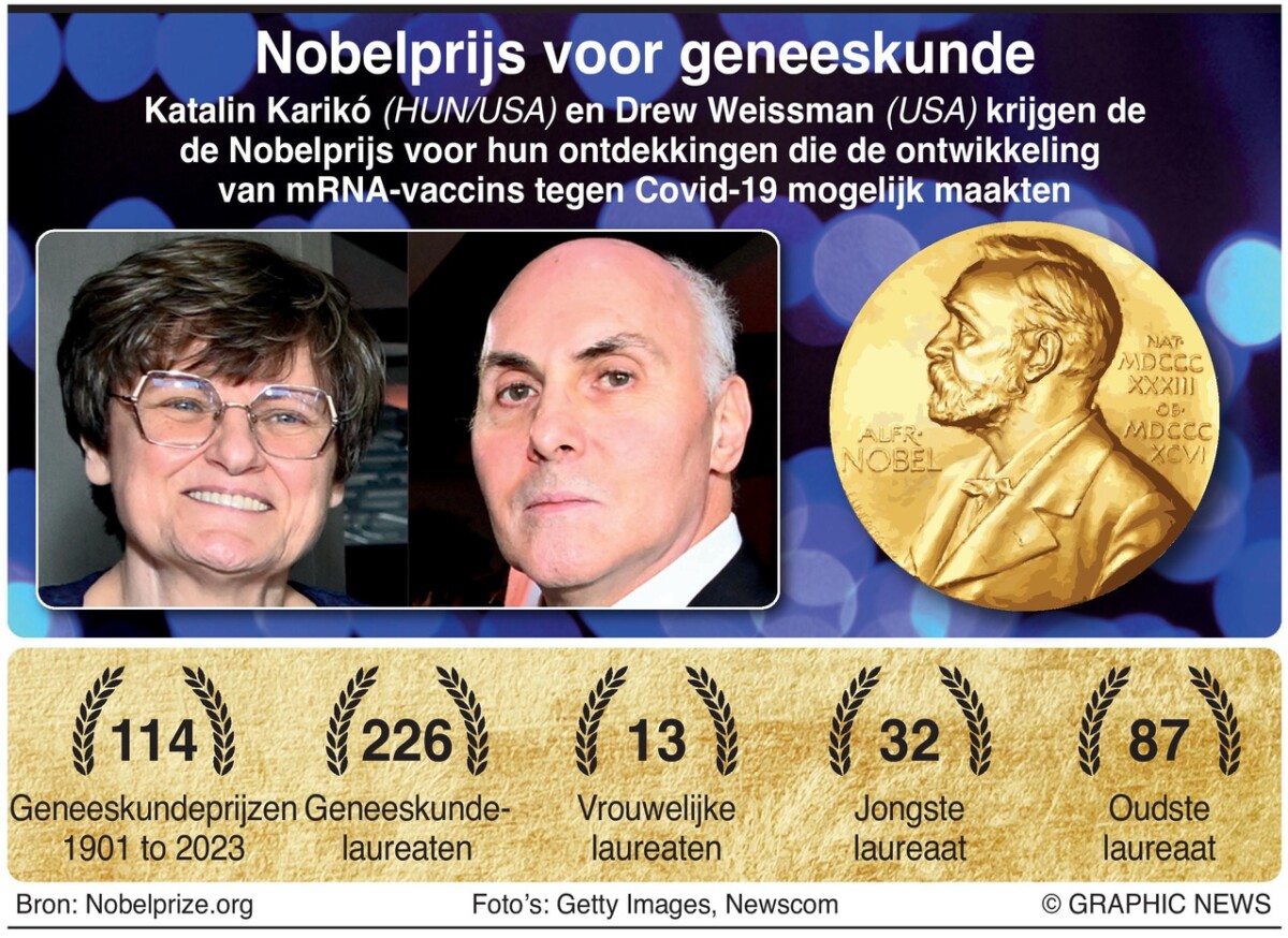 2 oktober 2023 – Katalin Karikó (HUN/VS) en Drew Weissman (VS) hebben de Nobelprijs gekregen voor hun ontdekkingen die de ontwikkeling van mRNA-vaccins tegen Covid-19 mogelijk maakten.
